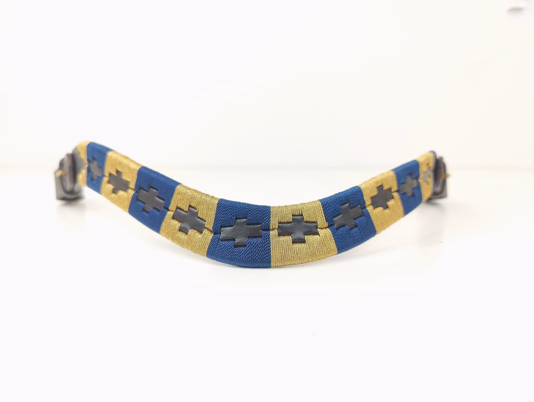Pannband i mörkbrunt läder, dekorerad med mörkblå och glitter guld tråd.